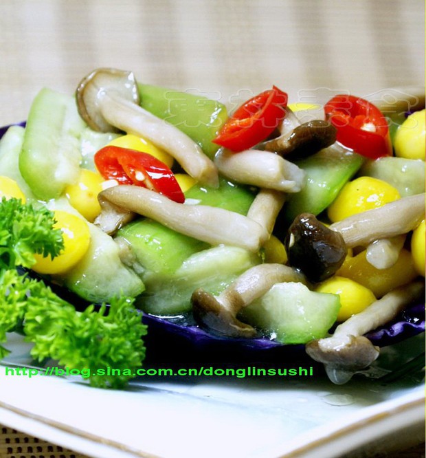 锅内底油,放姜末煸香,倒入草菇、蕃茄煸炒,中火爆炒倒入滑油原料丝瓜、紫甘蓝、百合,翻炒均匀,加清水20克调入少许素得鲜(代替味精),略微勾一点点薄芡炒匀,淋一二滴香油,翻匀起锅,盛入盘内稍摆盘即可