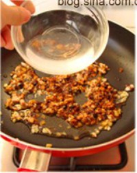 锅内入油,放入花椒,葱白,姜末,蒜末爆香,接着放入剁好的肉末炒熟