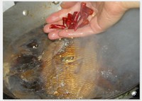 2. 加入料酒、姜末、酱油、精盐、葱段、几个干红辣椒,清水,一起烹调