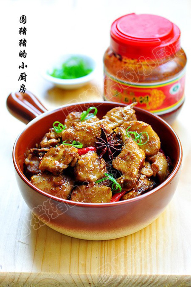 加入鸡块,用中火翻炒至色泽由红转白色,肉质变紧缩,加入米酒少量,炒至酒味散去后加入陴县豆瓣酱炒匀