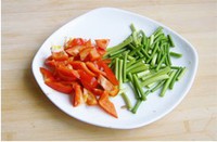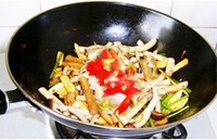 最后放蒜苔、红椒,大火急炒,加盐、生抽和少许糖调味,即可出锅