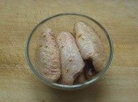 鸡翅装入碗里,调入桂花酒、鲜桂花、糖桂花、生抽、盐、姜泥拌匀后腌制5分钟