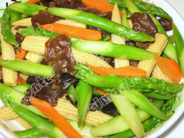 把汆烫过的芦笋,木耳,玉米笋和胡萝卜放入翻炒均匀,下盐,糖和鸡精调味即可。清爽可口,小孩子也喜欢吃哦
