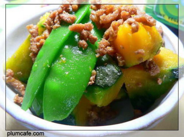 5. 把煮好的南瓜和荷兰豆先用盐啊,糖啊,酱油啊什么的,反正就用自己喜欢的调料先拌拌,让它入味一会儿。等吃的时候,浇上煮好的肉糜,拌匀即可