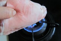 在火上烧将肘子有毛的地方烧掉,再用刀刮洗干净