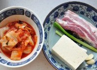 辣白菜切段、五花肉切片;葱、大蒜切碎