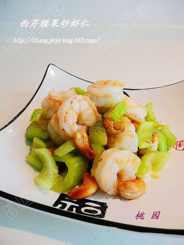 锅下姜末爆香,下西芹、虾仁、腰果炒匀,加盐、胡椒粉翻炒均匀,勾薄芡、淋少量麻油翻炒出锅