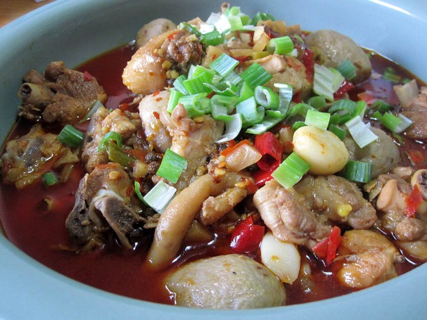 公鸡一只治净宰成小块,滗去血水,在炸过芋头的油中将鸡肉下入炒干水分捞出,