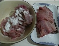将鱼排切成段,鱼头一分为二,与鱼尾合放一个容器中,鱼肉也分放一容器中,分别加入一个蛋清、一茶料酒、适量生粉、盐拌匀,腌制20分钟左右