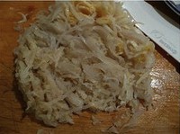 酸菜多洗几遍,片片,切丝,用清水泡一会儿,攥净水份