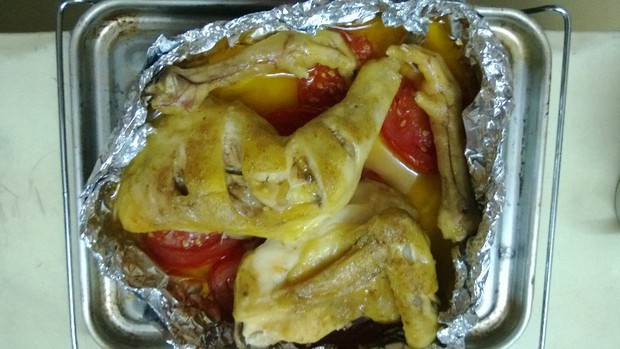 其实就是懒到家的做法把一切简化没有烤盘就用锡纸包呗不喜欢香菜不喜欢葱不喜欢蒜于是什么都没加照样美味然后番茄比鸡好吃喜欢吃的童鞋可以多加番茄哈用烤盘就不用锡纸嘿嘿