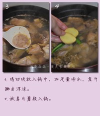 鸡切块,放入锅中,倒入足量冷水,煮开,撇去浮末