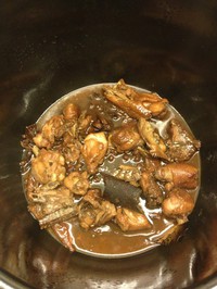 电饭煲滴少许油,把配量从配料碗里捞出,入油爆香。加入鸡一起炒香,把鸡肉各面都上油,保证上色。然后加入剩余的酱料汁,一起开煮饭档煮30分钟。中途鸡肉翻面,保证上色。