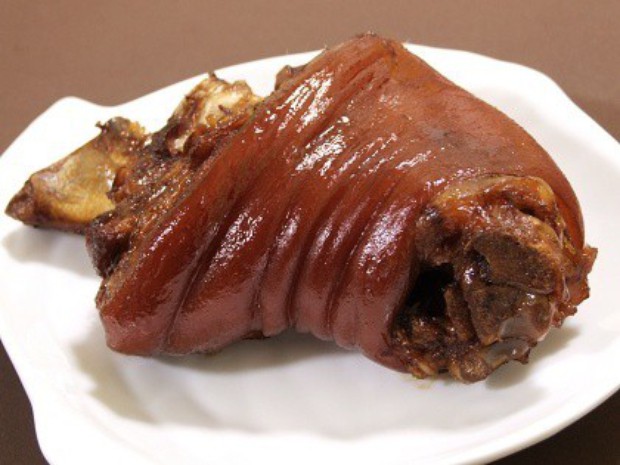 蹄膀洗净放入锅中约煮3分钟,取出,去除杂质入卤汤中,大火至汤滚后转小火,卤制1.5个小时,浸泡4小时以上入味,取出控去水分即可切开食用