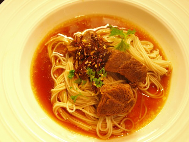组合的时候,下把煮好的面放在盘子里,然后浇牛肉汤。再把牛腩摆好,夹一些灯影牛肉放在上面,最后香菜装饰即完成