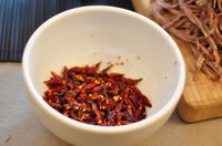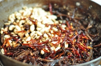 盛出花生后往锅内放稍多的油,大约是炒菜的3倍量,放撕好的牛肉丝和花椒面,中小火翻炒10分钟至牛肉水分煸干