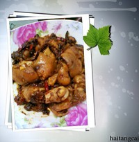 将猪蹄和少许的盐,糖,料酒,2颗茴香,小片桂皮,葱白,姜,放入锅内一起炖.炖至骨肉分离几可以了