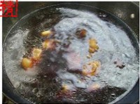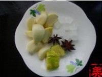 7. 锅里添水,水开后放煮过的猪蹄、姜、蒜、八角、冰糖