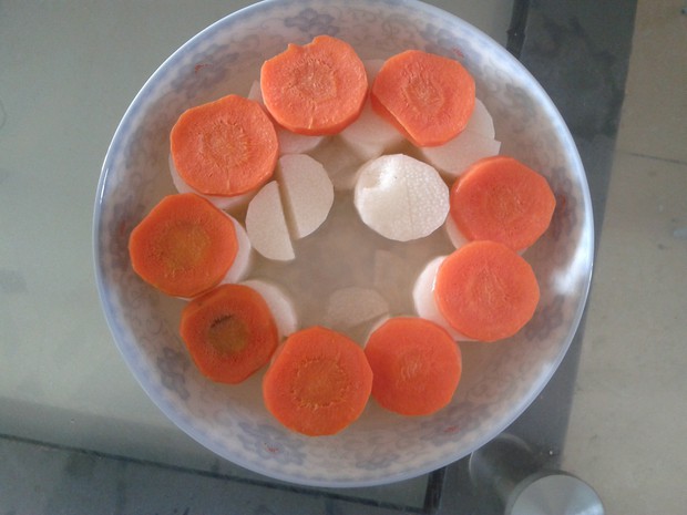 1. 山药切成柱状然后竖向一分为二。胡萝卜切成片状。