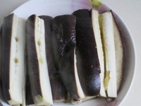 茄子洗净,从中间切成两截后,对半切开,然后切成稍微大块点的条状,码如盘中