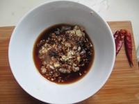 开小火,锅中放入适量底油,几粒花椒,待锅六成热时,加入一勺豆瓣酱,炒开,直到能闻到弄弄的香味。开大火,油冒烟后,迅速倒入刚才准备的调料碗中,用勺子拌匀