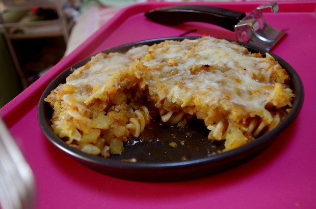 把空心粉铺在盘底,别太厚了,然后淋番茄酱,然后把南瓜番茄碎铺上,压压,最后撒上马苏里拉奶酪就成