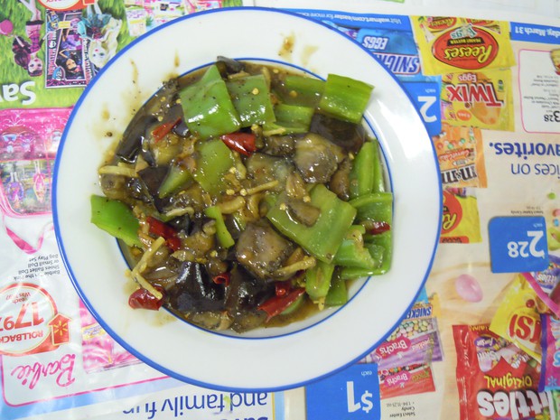 5. 茄子下锅,翻炒,加青椒,继续翻炒,加调好的汁儿,大火收汁,出锅