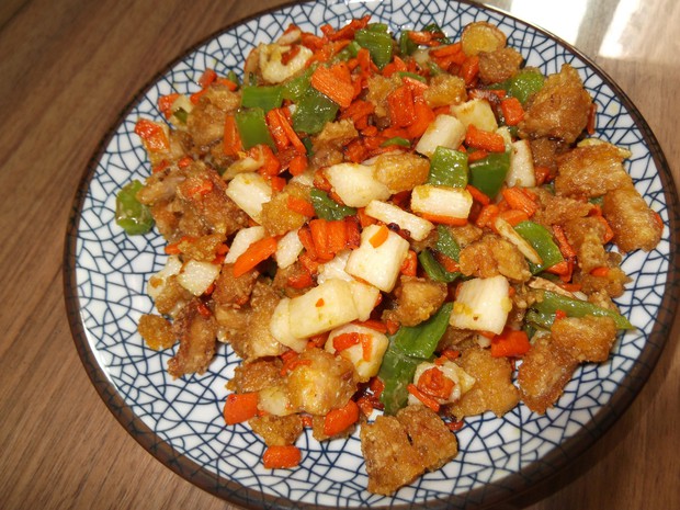 把青椒丁、胡萝卜丁、山药丁一起放入锅中,加入花椒和姜片,用煎素肉柱剩余的油继续炒,炒至断生,加入盐翻炒均匀。