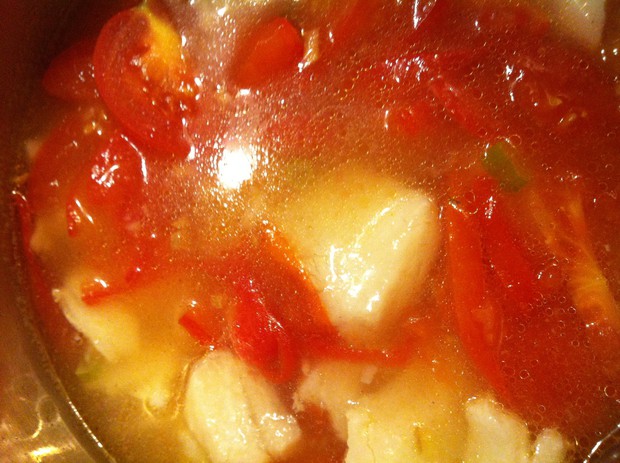 锅中放油,加入葱姜爆香,然后加入番茄片翻炒,稍微出红油后加入高汤,再加入盐,胡椒粉,糖调味,水开后关小火,加入鱼肉,最后加入淀粉水勾芡,关火