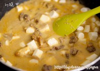 加入混合了开水的牛奶,不要直接加冷的,容易把药弄得咬不动。沸后加咖喱,一盒里可分五块,我加了三块,再加椰蓉,也可不加~