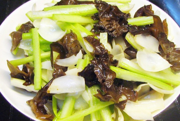 1. 干木耳用冷水泡开,切成丝。西芹切成丝