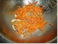 4. 下入胡萝卜丝继续煸炒至熟,盛出,与金针菇一道放在大碗中