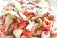 鱿鱼先下锅,炒至3成熟捞出,香菇红椒青菜丝下锅翻炒半分钟,倒入鱿鱼丝,加入盐和味精或鸡精【关于加多少根据菜的量来定】