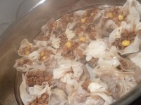 准备馅料.按时间顺序:头天晚上泡糯米。在冷水中浸泡4-12个小时。之后上锅,加屉布,蒸15-20分钟至熟。Tips:蒸出来的糯米粒粒分明比较好炒,但是稍微有点儿干。下次我要试试煮的。