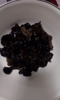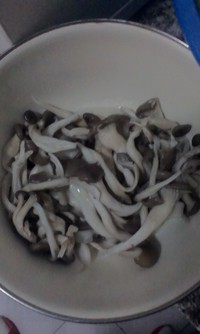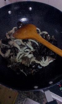 尝下木耳平菇差不多熟了,把切好的葱姜蒜倒进去炒匀。这时候把调好的生粉倒进去就可以出锅了。