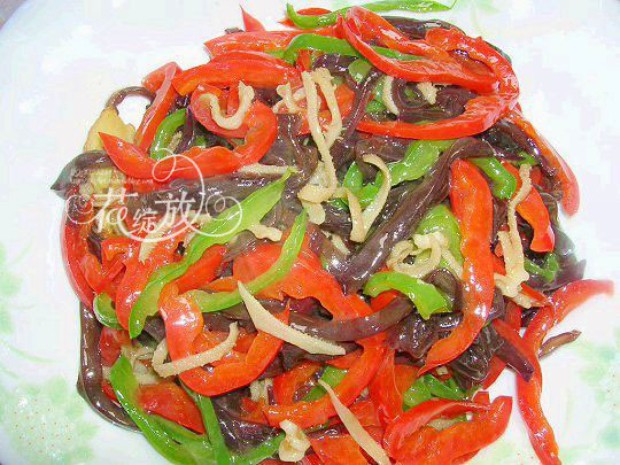 锅中加水烧沸后倒入木耳、红、绿椒丝焯一下捞起过凉水待用