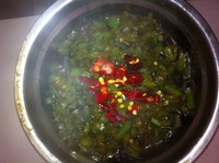 4. 干辣椒放在青椒皮蛋上面,锅中放少许油加热浇在干辣椒上面