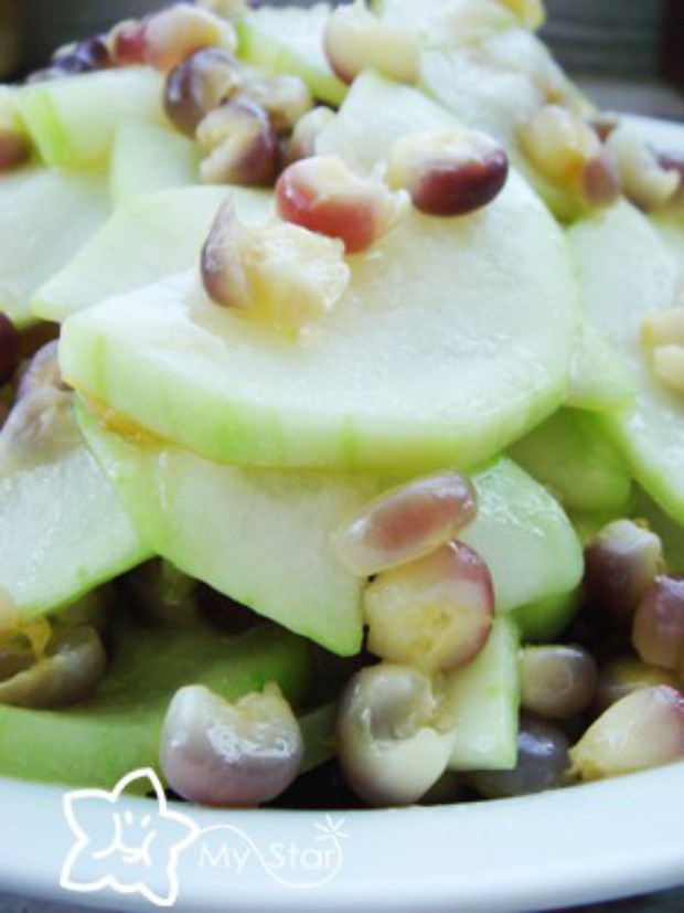 3. 锅里放点油,油热后,放入瓠子片炒软,然后加入玉米翻炒,加些盐和浓缩鸡汁(鸡粉也行),出锅前再撒一点点、一点点的糖来提下鲜就好了。味道很清爽的夏天菜