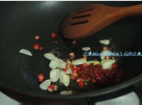 锅里加少许底油,小火下入豆瓣酱和花椒炒香,然后加入小红椒碎和青豆炒香,放入盐,糖,炒到青豆变色