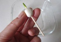 将莲子米的绿色外壳剥去后,用牙签从莲子米底部穿过去,去掉莲心