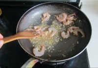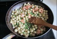 四、将姜末和葱末爆香,加入虾仁翻炒,变色后加入焯好的莲子米和青豆,最后倒入碗汁,翻炒均匀,待形成薄薄的芡汁后关火。
