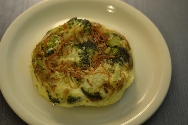 小号的不沾锅中下油,小火煸香洋葱碎,加入西兰花、松子、胡萝卜丝大火炒熟,加盐