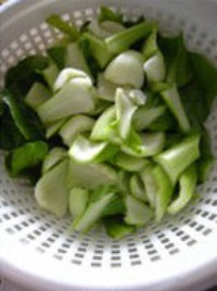 小青菜一片片叶子掰开来洗干净,切成段,把梗和叶分别放成2堆,沥干水分备用