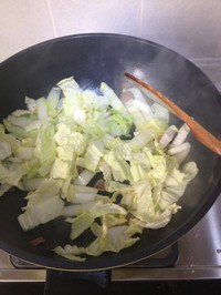 白菜梗快熟的时候,放白菜叶翻炒。加点料酒和盐