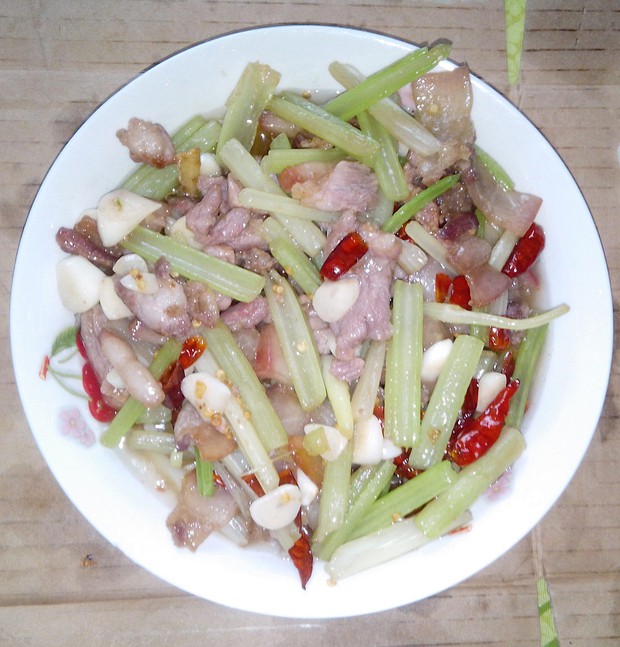 3. 另起锅放油,烧7成热时放入大蒜籽和干红辣爆香,再放芹菜快速翻炒,快熟时放入肉片,翻炒均匀即可