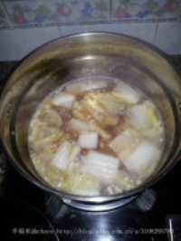 在锅中加水,倒入刚炒过的大白菜及肉片,待水滚后转小火慢慢熬约15分钟;