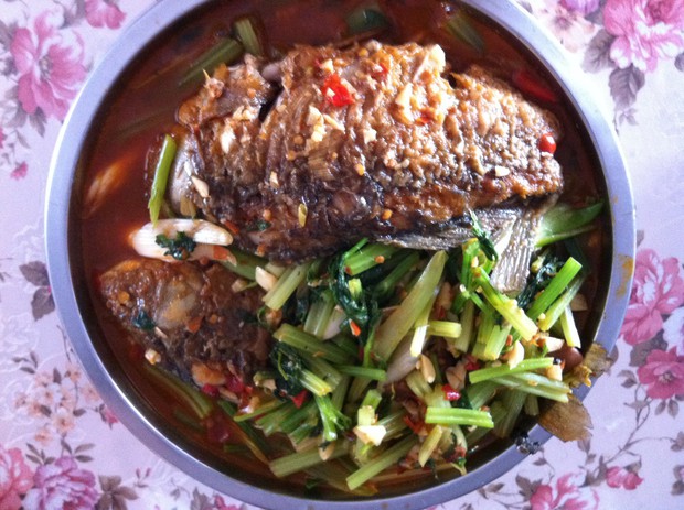 烧好后,只将鱼盛出,汤汁仍然留在锅里,此时加入芹菜、葱炒熟。