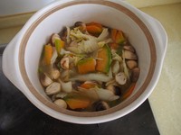 1. 娃娃菜切粗丝。南瓜切厚片。草菇对半切,焯水。粉丝泡软剪断