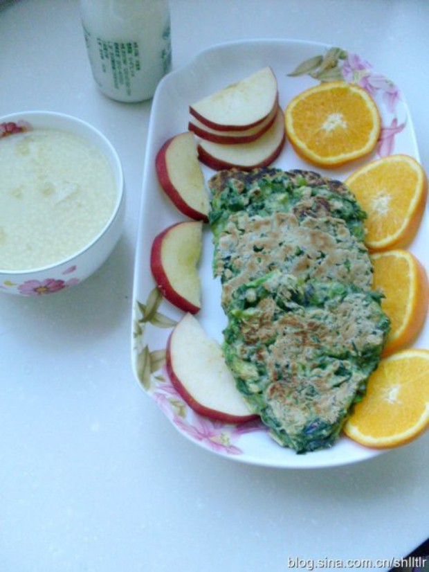 我家女儿今年初中毕业,6月份参加中考。在中考期间,学生们复习任务繁重,大脑处在高度紧张状态,身体能量消耗多,食欲往往不佳,再加上生活规律被打乱,身体抗病能力降低,很容易生病。我想家有参加中高考学生的家长,特别是我们这些主妇,当前最重要的任务就是,一个给孩子减压,做好思想梳理,再一个就是安排好这个阶段一日三餐的饮食营养,对保证考生的身体健康和使大脑处于良好状态极为重要。饮食上要多吃易于消化又富于营养的食物,保证足够的蛋白质,辅助地吃一些富含维生素B、维生素C的食物,以及富含胆碱的食物,如杏、香蕉、葡萄、橙、鱼、深色绿叶蔬菜等也有一定的益处。一日三餐中早餐尤为重要。因为青少年时期身体发育较快,常常肌肉、骨骼一齐长,特别需要足够的钙、维生素C、A等营养素来帮助身体的生长发育。因此,青少年合适的早餐是一杯牛奶、一个新鲜水果、一个鸡蛋和二两干点(主要是馒头、面包、饼干等碳水化合物)。本着这个原则,做了这份早餐,菠菜饼+小米粥+酸奶+苹果+橙子,送给备考的中学生。