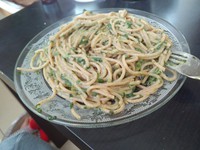 把煮好的意面捞出,和菠菜碎一起防在平底锅上。加一大勺煮面和菠菜的汤汁,用中火翻滚一会儿(不要翻的太干哦保持湿润就好)